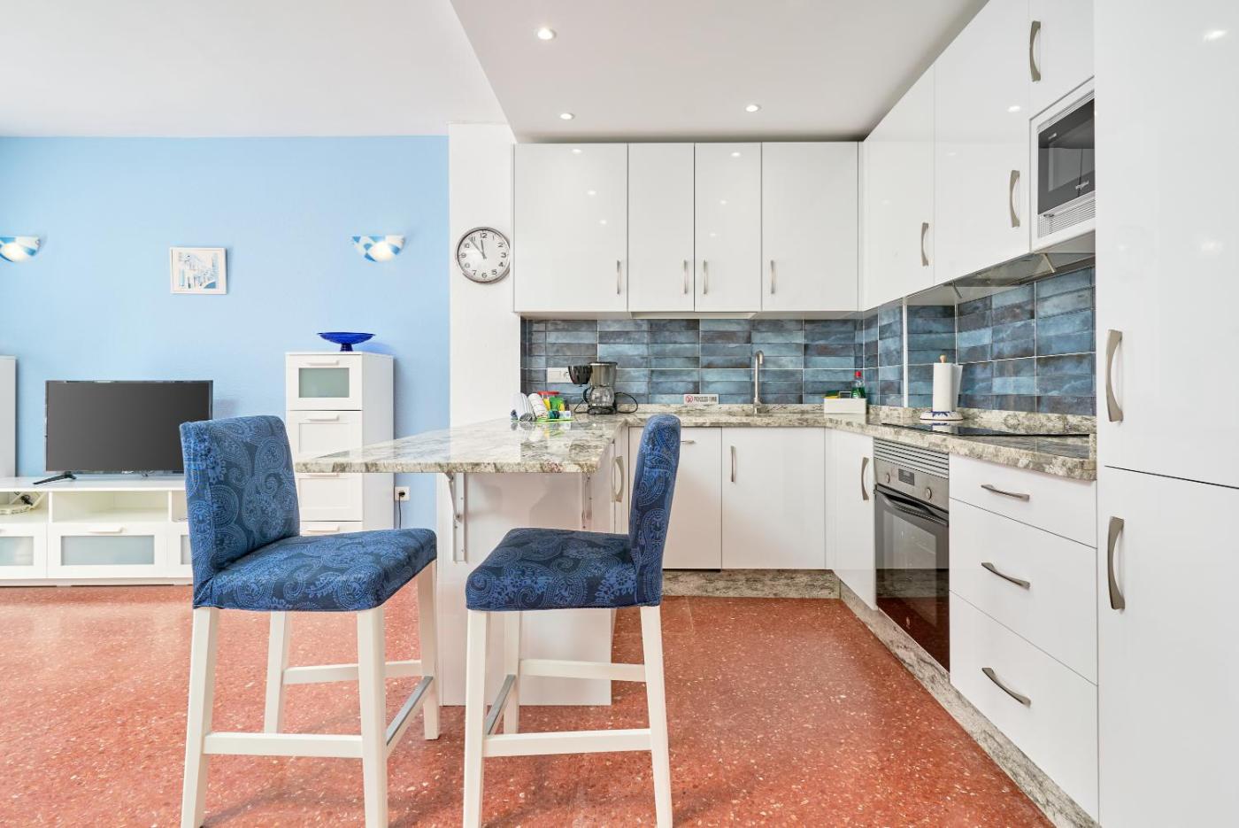 Apartamento Deluxe de 2 dormitorios con vistas al mar. This apartment has a private balcony with sea view and a fully equipped kitchen with stove top, a fridge and a microwave.